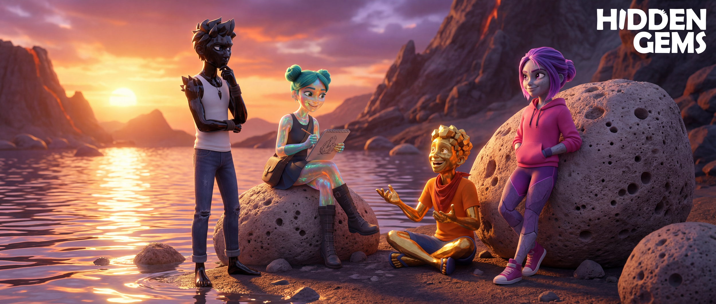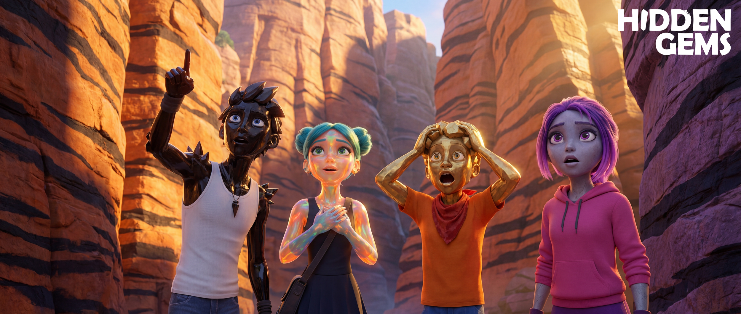 Hidden Gems takes place in a vivid world of prismatic color where all the human-like beings, plants, and animals are living rocks and minerals. The Rock families live in sturdy rock neighborhoods and send their rock children to rock school. The Mineral families live in fancier mineral neighborhoods where mineral children attend mineral school and parents work at mineral companies.